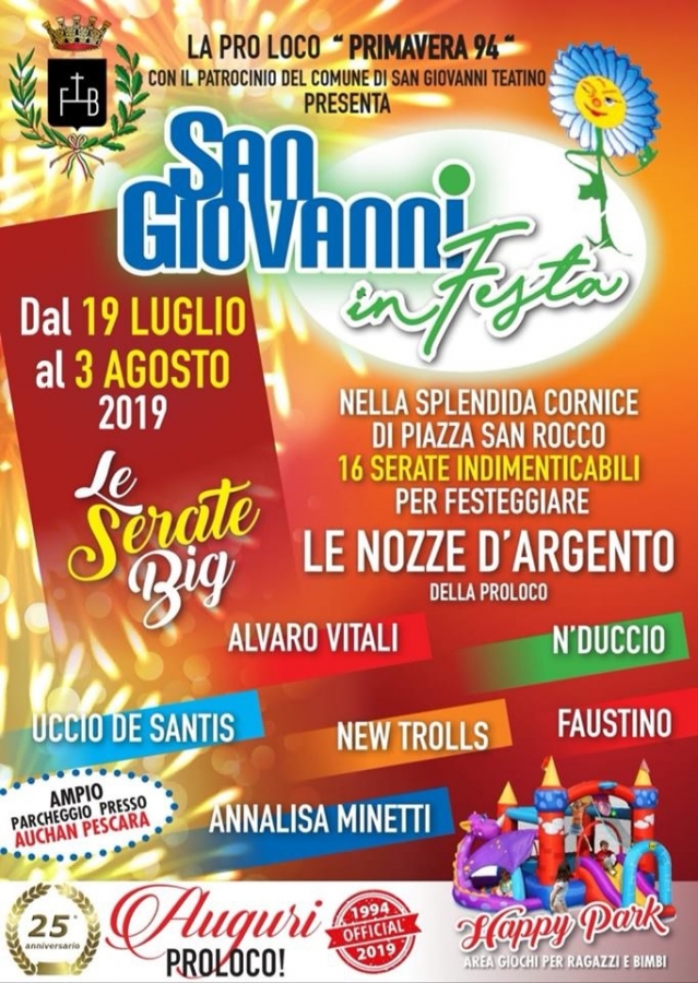 San Giovanni in Festa è il primo a partire e si sposta in piazza San Rocco, in pieno centro di Sambuceto. "16 serate indimenticabili" da venerdì 19 luglio a sabato 3 agosto per festeggiare i 25 anni della Pro Loco Primavera 94 che da 4 anni organizza l'evento patrocinato e sostenuto dal Comune di San Giovanni Teatino.