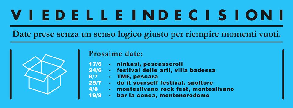 Contatto che ritroverà a breve grazie ad una prima serie di date estive nel Pescarese/Teatino: 24/6 @ Festival delle Arti, Villa Badessa (PE); 8/7 @ TMF, Pescara; 29/7 @ Do It Yourself Festival, Spoltore (PE); 4/8 @ Montesilvano Rock Fest (PE); 19/8 @ Bar La Conca, Montenerodomo (CH).