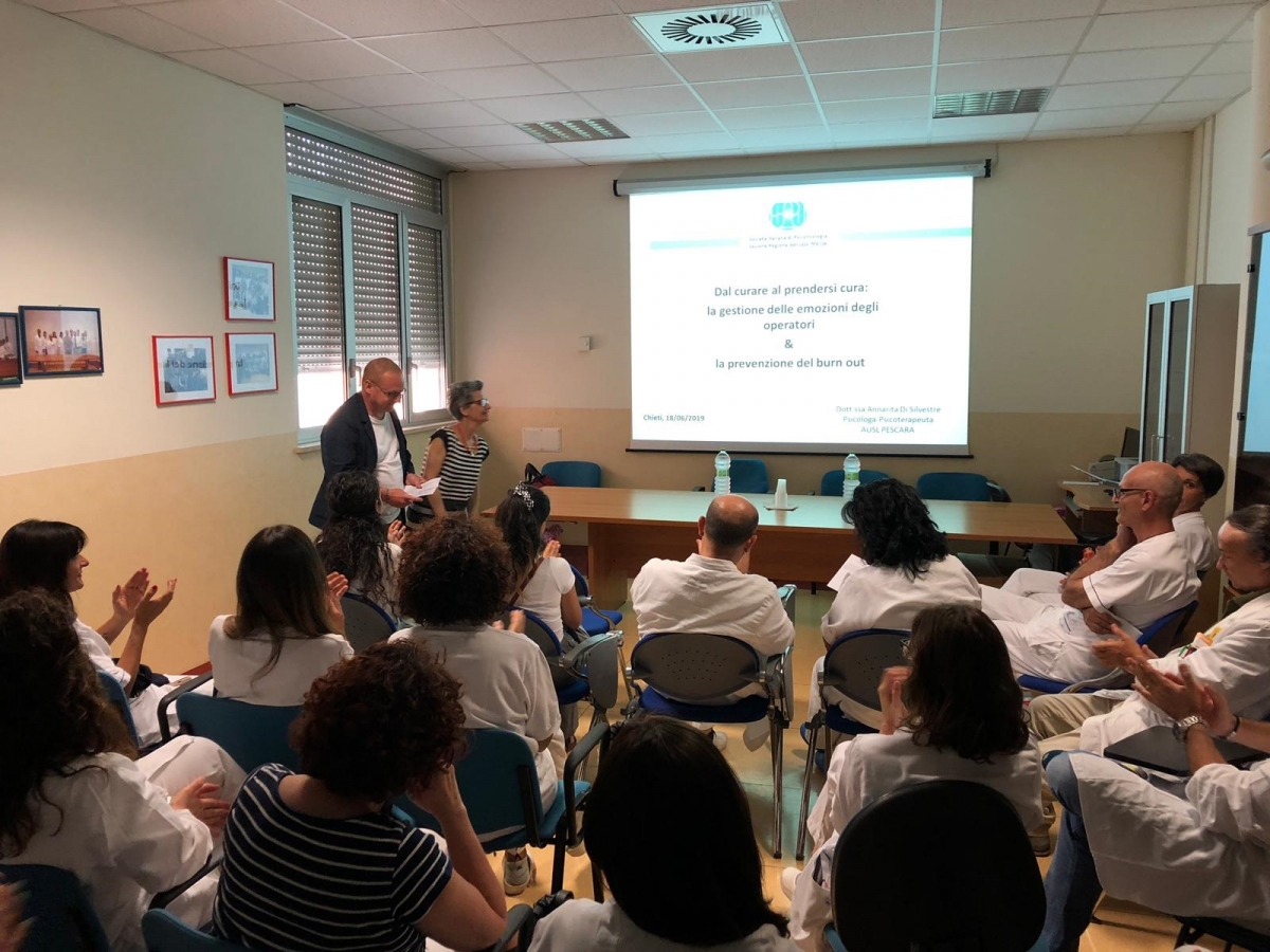 Su una specifica richiesta di tutti gli operatori del Reparto, Medici, Tecnici, Infermieri, Fisici Sanitari e Amministrativi, è stata invitata a svolgere una Lettura dal titolo “Dal Curare al Prendersi Cura: la gestione delle emozioni degli operatori e la prevenzione del Burn out” la Dr.ssa Annarita Di Silvestre, Coordinatore per le Regioni Abruzzo-Molise della Società Italiana di Psico-Oncologia (SIPO).