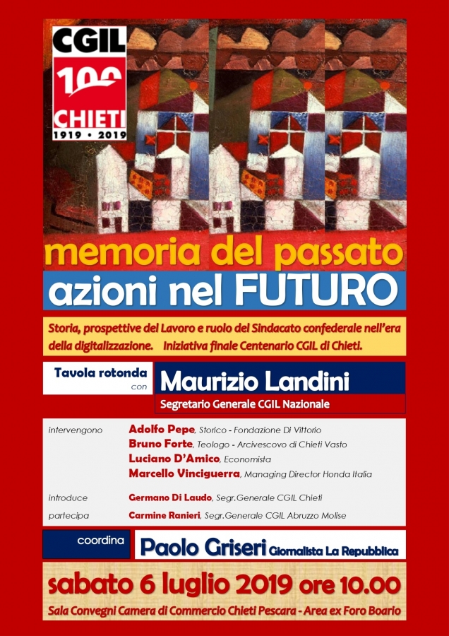 L'appuntamento con la tavola rotonda dal titolo 'Memoria del passato, azioni nel futuro - Storia, prospettive del Lavoro e ruolo del Sindacato confederale nell'era della digitalizzazione" è per sabato 6 luglio, alle ore 10.00, nella sala convegni della Camera di Commercio Chieti Pescara (area ex Foro Boario).