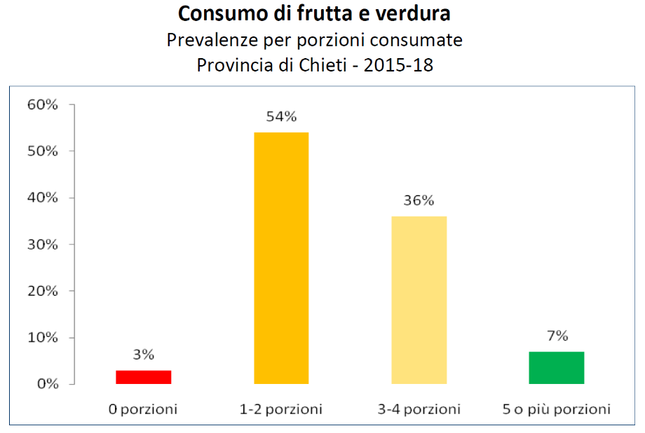 Sempre in provincia di Chieti l’abitudine a consumare cinque o più porzioni di frutta e verdura al giorno (il cosiddetto five-a-day) è più diffusa nelle persone sopra ai 50 anni (il 9%), nelle donne (7%), nelle persone con basso livello d’istruzione (16%) e nelle persone obese (9%). Non emergono importanti differenze legate alla condizione economica.