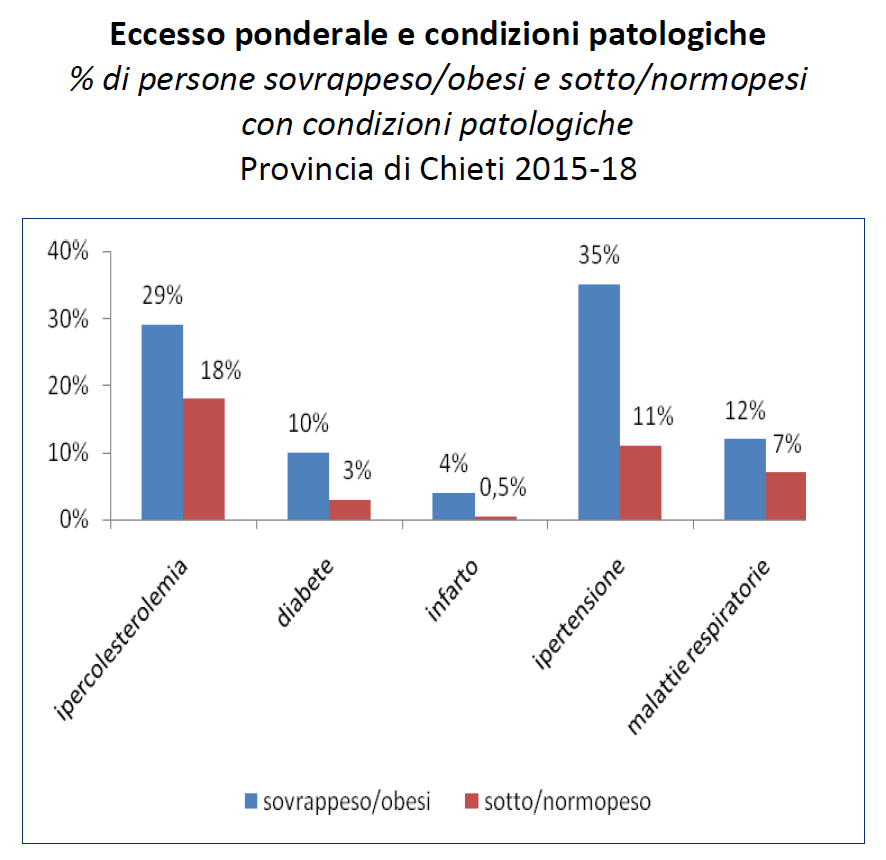 E’ evidente come alcune patologie siano più frequenti tra i soggetti sovrappeso e obesi rispetto ai sottopeso o normopeso: in provincia di Chieti l’ipercolesterolemia ha una frequenza del 29% nel primo gruppo rispetto al 18% del secondo gruppo; il diabete del 10% contro il 3%; l’infarto del 4% contro lo 0,5%; l’ipertensione del 35% contro l’11%; le malattie respiratorie del 12% contro il 7%.