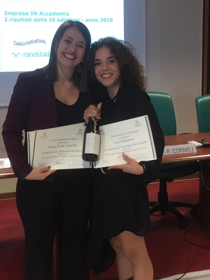 Florio Corneli, Presidente di FEDERMANAGER Abruzzo e Molise, e Elisa Maiolo, Presidente dell’Associazione CREALAVOROGIOVANI, assegnano il primo premio: un percorso di coaching di 6 incontri alle studentesse di Economia Aziendale, Lucia Borghesi e Maria Giulia Crecchia, che hanno svolto lo stage presso la TOP Solutions, sotto la guida di Alessandro Addari. Quest’ultimo ha evidenziato l’impegno che le vincitrici hanno messo nel portare a termine il percorso, proponendo dopo un’attenta analisi di marketing un miglioramento delle strategie di comunicazione dell’azienda anche attraverso i social.