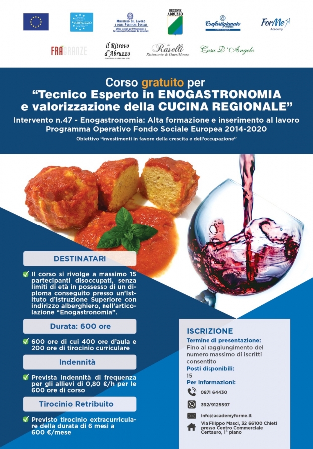 La cucina abruzzese intesa come eccellenza, con le sue peculiarità e i suoi prodotti tipici, al centro del nuovo corso gratuito "Tecnico esperto in enogastronomia e valorizzazione della cucina regionale", promosso da Academy ForMe. L'iniziativa è rivolta a quindici studenti disoccupati o inoccupati, in possesso di diploma conseguito in un istituto alberghiero (articolazione 'enogastronomia').