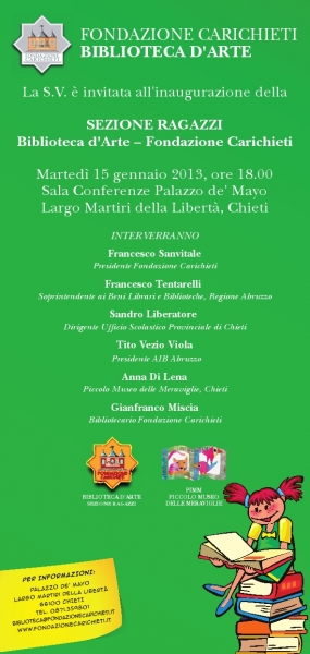 Martedì 15 gennaio, alle ore 18.00 nella cornice storica di Palazzo de' Mayo, sede della Fondazione Cassa di Risparmio della Provincia di Chieti, sarà inaugurata la SEZIONE RAGAZZI della Biblioteca d'Arte - Fondazione Carichieti (Sala Conferenze Palazzo de' Mayo, Largo Martiri della Libertà , Chieti).