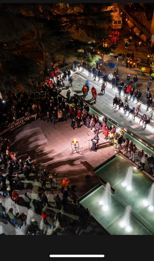 Alle 21 nell’area antistante il Tribunale, in via XX Settembre, si sono radunati i cittadini, il Comitato familiari delle vittime e le autorità con le torce in mano. Dopo un percorso di 800 metri, la sosta davanti all'ex Casa dello Studente, dove hanno perso la vita 8 universitari. A seguire l’arrivo al Parco della Memoria, a piazzale Paoli, inaugurato lo scorso anno alla presenza del premier Mario Draghi. Proprio al Parco il “braciere della memoria”, omaggiato dalla presenza di un alpino, un agente di polizia, un carabiniere, un finanziere e un agente di polizia municipale, è stato acceso da un’atleta della Nazionale ciclisti Ucraina, Valeriia Kononenko, insieme a un Vigile del Fuoco. È seguita la lettura dei 309 nomi delle persone scomparse nella notte tra il 5 e il 6 aprile.