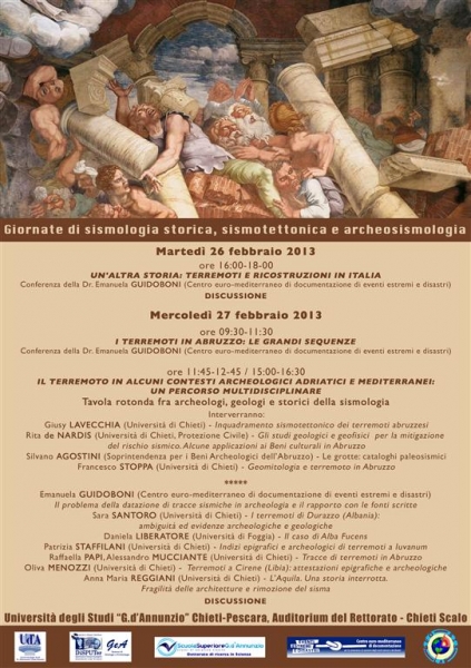 Chieti – Con l'intento di chiarire a studenti, geologi e ingegneri ma anche ai cittadini interessati, il quadro della sismicità storica e attuale in Abruzzo, e di favorire la collaborazione interdisciplinare, la sezione di Geo-Archeologia del DiSPUTer e la Scuola Superiore dell'Università G. d'Annunzio ha organizzato una due giorni (26 e 27 Febbraio) denominata “Giornate di Sismologia Storica, Sismotettonica e Archeosismologia”.