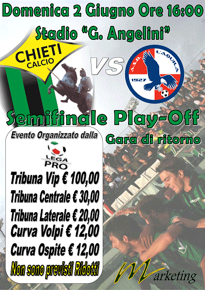 La Chieti Calcio comunica che sul territorio aquilano il punto vendita abilitato (circuito CiaoTickets) alla prevendita dei tagliandi di settore ospiti è: MULTI SERVICE M3 - Centro Commerciale 4 Cantoni - L'Aquila