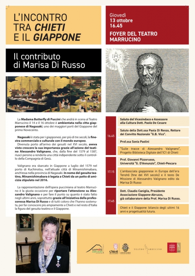 “La rappresentazione dell’opera pucciniana al teatro Marrucino è la giusta occasione per riportare l’attenzione sul grande gesuita teatino e per fare il punto su quanto è stato fatto negli ultimi anni, soprattutto grazie all’iniziativa della professoressa Di Russo, e di tutti coloro che l’hanno sostenuta, per far conoscere più ampiamente, a Chieti e nel resto d’Italia, Alessandro Valignano e il Giappone – così Claudio Caniglia, presidente dell’associazione Giappone in Abruzzo - Il Giappone, visto come luogo esotico e lontano, esercitò un grande fascino sull’arte e la cultura europea di fine ottocento e inizio novecento generando un fenomeno noto come Giapponismo. La Madama Butterfly di Puccini è una delle opere più riuscite all’interno di questo filone. Essa rappresentò un’occasione, che si offriva al grande pubblico, per entrare in contatto con la realtà “altra” di un Paese che allora si andava affacciando sulla scena storica mondiale. Per quanto l’immagine del Giappone della Madama Butterfly fosse poco accurata e ancora intrisa di esotismo, molti poterono percepire attraverso di essa gli echi di un mondo distante e ricco di fascino, immedesimandosi nelle vicende della sfortunata protagonista. Ma il legame della città di Chieti con il Giappone e in particolare con l’area di Nagasaki risale a un periodo che precede di più di tre secoli la composizione dell’opera pucciniana. Divenuta porto all’arrivo dei gesuiti nel XVI secolo, Nagasaki aveva visto crescere la sua importanza proprio grazie all’azione del teatino Alessandro Valignano (1539-1606), che, dalla fine del 1579 al 1587, riuscì persino a renderla una città indipendente sotto il controllo della Compagnia di Gesù. Valignano era sbarcato in Giappone a luglio del 1579 nel porto di Kuchinotsu, nell’attuale città di Minamishimabara, anch’essa nella provincia di Nagasaki. In nome del gesuita teatino, Minamishimabara è legata a Chieti da un patto di amicizia stipulato nel 2016. Durante tutto il suo operato Alessandro Valignano, Visitatore, ovvero supervisore, di tutte le missioni gesuitiche in Asia dal 1573-1595 e di quelle di Cina e Giappone fino al 1606, volle fortemente che i missionari approfondissero lo studio della lingua e della cultura giapponese per poter diffondere il cristianesimo nel paese del Sol Levante fondando seminari e collegi.