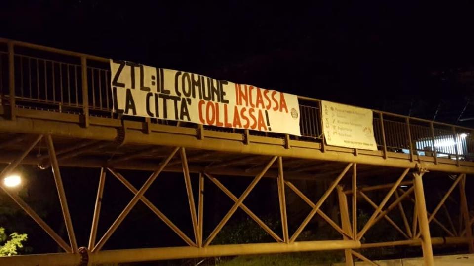 "Ztl: il Comune incassa, la città collassa": questo il testo dello striscione affisso dai militanti di CasaPound nei pressi di Santa Maria, a Chieti, per criticare la nuova politica del comune riguardante le zone a traffico limitato e l'attivazione delle telecamere ai varchi.