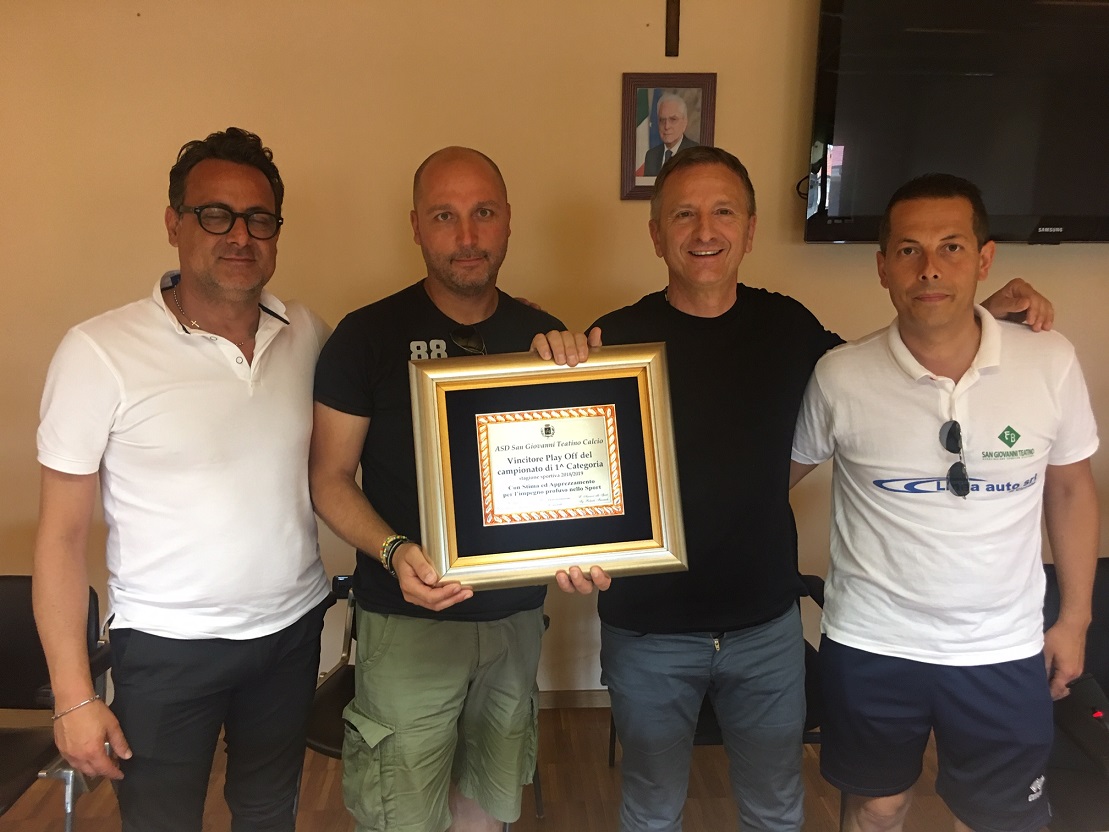 Bel corso di una cerimonia che si è svolta nella sala consiliare di Palazzo di Città , il sindaco Luciano Marinucci e l'assessore allo Sport Roberto Ferraioli hanno consegnato una targa speciale all'ASD San Giovanni Teatino Calcio vincitore dei play off del campionato di Prima Categoria stagione 2018/2019 con il salto nel campionato di Promozione.