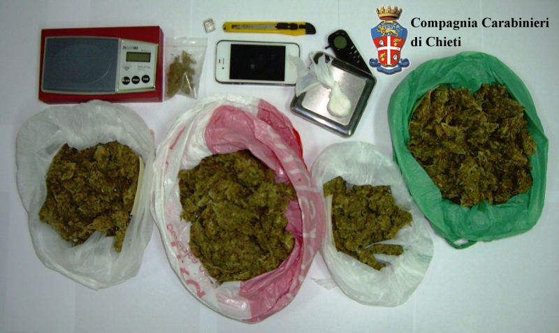 CHIETI – Ha cercato di mascherare il nervosismo e la preoccupazione per quel controllo improvviso dei carabinieri mostrandosi, con loro, insofferente. Un atteggiamento insolito quello assunto da T.I., operaio 28enne di Sambuceto, che ieri sera è incappato in un posto di controllo alla circolazione stradale messo in atto dai Carabinieri del Nucleo Operativo e Radiomobile della Compagnia di Chieti. L’uomo, fermato nei pressi della zona industriale di Sambuceto a bordo della sua auto, non aveva al seguito la patente di guida ed un documento d’identità. Inevitabilmente i militari dell’Arma hanno dovuto fare delle verifiche per accertare la sua reale identità e controllare se fosse realmente in possesso di una licenza di guida valida. E’ stato a questo punto che l’uomo si è mostrato molto infastidito dai controlli effettuati dei carabinieri quasi volesse far intendere che gli stavano facendo perdere tempo. Un comportamento che ha insospettito  gli uomini dell’Arma che hanno iniziato a dubitare che l’uomo avesse qualcosa da nascondere e quindi fretta di andare via. In effetti motivi per preoccuparsi il 28enne ne aveva: quando i Carabinieri hanno controllato nella sua auto, nel portaoggetti hanno trovato un vasetto con 4 grammi di marijuana. Ne è scaturita una perquisizione che poi è stata estesa anche alla sua abitazione malgrado il 28enne, più volte, avesse garantito ai carabinieri di non detenere altro stupefacente. In realtà, in un armadio della camera da letto, sono stati rinvenuti 5 grammi di cocaina mentre nella soffitta, nascosti tra alcuni scatoloni contenenti della roba vecchia, sono stati recuperati altri quattro involucri contenenti complessivamente 303 grammi di marijuana ed un grammo di hashish. Un quantitativo di stupefacente che una volta immesso sul mercato avrebbe fruttato un guadagno di circa 400 euro per la cocaina e 3mila euro per la marijuana. Sequestrati nell’abitazione anche due bilancini di precisione e materiale per il confezionamento in dosi. Arrestato con l’accusa di detenzione a fini di spaccio di sostanze stupefacenti, l’uomo è stato posto dall’A.G. in regime di arresti domiciliari presso l’abitazione dei genitori. Questa mattina, nel corso del processo con rito direttissimo, il Giudice ha convalidato l’arresto operato dai Carabinieri ed ha disposto per il 28enne l’obbligo di dimora nel comune di Sambuceto.