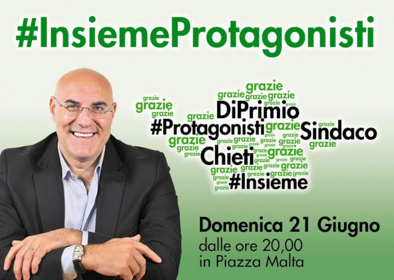 Con queste parole il sindaco di Chieti Umberto Di Primio, appena riconfermato anche per il secondo mandato alla guida del capoluogo teatino, invita tutti all’evento intitolato “#InsiemeProtagonisti”, che si terrà domenica 21 giugno, a partire dalle ore 20, in Piazza Malta a Chieti.