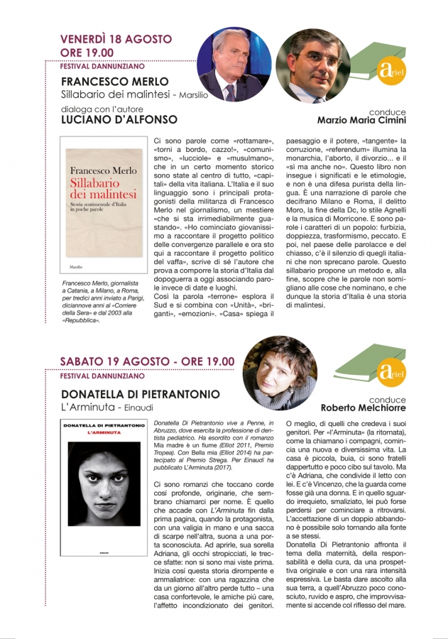 Sabato 19 agosto serata conclusiva del Festival Dannunziano. “Ariel a Castello” dedica l’ultimo appuntamento alla scrittrice abruzzese Donatella Di Pietrantonio e al suo nuovo romanzo, L’Arminuta, successo editoriale pubblicato da Einaudi. Definita da Michela Murgia “una delle più importanti scrittrici italiane”, la Di Pietrantonio – già autrice di Mia madre è un fiume e Bella mia (Elliot) – narra le vicende dell’Arminuta, “quella che è ritornata”, appunto, una ragazzina di tredici anni che, per motivi a lei incomprensibili, viene riportata dallo zio che l’ha adottata da piccola alla sua famiglia d’origine. L’abbandono, l’amore, il dolore, gli affetti familiari sono i temi affrontati dalla scrittrice con rara intensità espressiva nel suo terzo romanzo, entrato nella “cinquina” del Premio Campiello 2017.