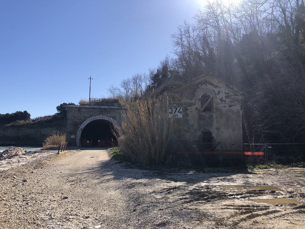 Scenari non dissimili una volta oltrepassati i luoghi cari al Vate: «Da qui in poi la pista presenta diversi blocchi e pezzi mancanti, principalmente in prossimità delle gallerie, che sono tutte chiuse. Così si oltrepassa Fossacesia Marina e si arriva a Torino di Sangro, dopo circa 8 chilometri: dalla vecchia stazione ferroviaria, per circa 3 chilometri, la pista è inesistente, con un tratto di oltre 200 metri crollato per le mareggiate. Una volta rientrati a Lido Le Morge, si torna per un paio di chilometri e mezzo sulla pista, in prossimità di Finisterrae a Casalbordino Lido, per poi tornare a interrompersi di nuovo per circa 4 chilometri fino a dopo il centro Vacanze Poker. Da questo punto in poi, invece, la pista diventa bellissima e per circa 8 chilometri, fino a Punta Aderci, corre su stabilizzante battuto per preservare il territorio della riserva e forma una lunga lingua bianca che si addentra fino al punto panoramico di Punta Aderci».