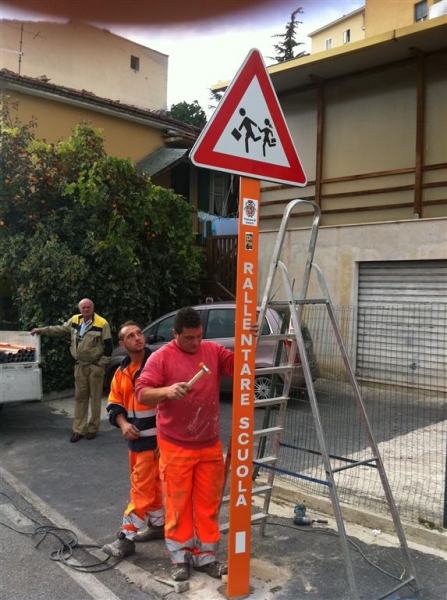 "Al fine di garantire una sempre maggiore sicurezza stradale per i pedoni e gli automobilisti - ha dichiarato il Sindaco - l’amministrazione comunale ha predisposto una serie di iniziative e progetti quali l’informazione degli utenti (con l’istituzione di corsi curati dalla polizia municipale), la realizzazione di infrastrutture in grado di aumentare la sicurezza della percorrenza delle strade cittadine (rondò, limitatori e rilevatori di velocità ) ed anche una migliore segnaletica stradale, soprattutto nelle aree limitrofe alle scuole, con l’installazione di nuove paline rivestite da guaine in materiale plastico, con colori che richiamano immediatamente l’attenzione degli automobilisti e con scritte rinfrangenti in grado di garantire massima visibilità anche nelle ore notturne ed in caso di nebbia"