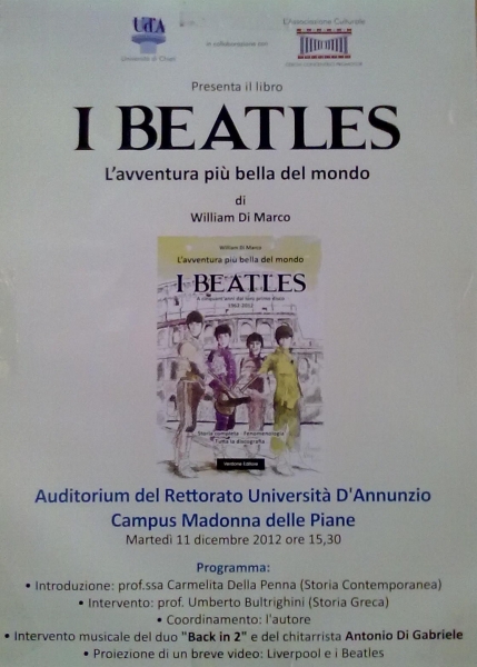 Chieti – Domani 11 dicembre alle 15.30 presso l'Auditorium del Rettorato Università D'Annunzio di Chieti (Campus Madonna delle Piane) sarà presentato il libro "I Beatles, l'avventura più bella del mondo" di William Di Marco.