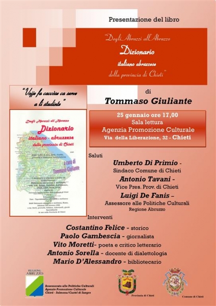 Domani 25 gennaio 2013 alle ore 17.00, presso la Sala di Lettura della Biblioteca Regionale in Via della Liberazione 32 di Chieti , l’Assessorato alle Politiche Culturali della Regione Abruzzo presenta il libro ”Dagli Abruzzi all’Abruzzo-Dizionario della provincia di Chieti” di Tommaso Giuliante.