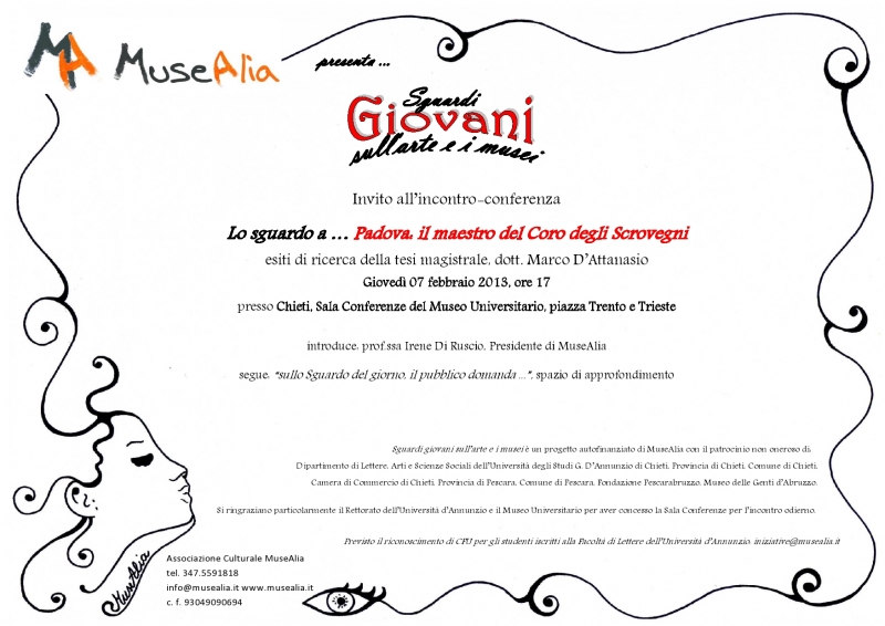 Giovedì 7 febbraio 2013 alle ore 17:00 a Chieti presso la Sala Conferenze del Museo Universitario a Piazza Trento e Trieste si terrà l'incontro-conferenza dal titolo "Lo sguardo a … Padova: il Maestro del Coro degli Scrovegni".