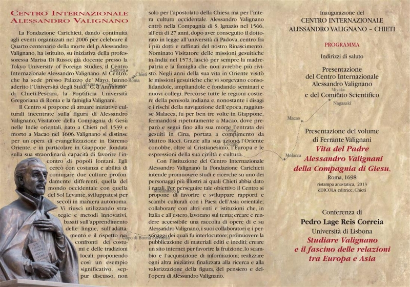 Verrà inaugurato giovedì 7 marzo, alle ore 17.30, presso l’Auditorium di Palazzo De Majo a Chieti, il Centro Internazionale Alessandro Valignano che ha tra i suoi obiettivi principali la promozione di studi e ricerche attraverso la realizzazione di iniziative culturali sulla figura del noto personaggio teatino (Chieti 1539- Macao 1606), che si distinse per la sua opera di evangelizzazione in Estremo Oriente “fondata sulla sua straordinaria capacità di favorire l’incontro di popoli lontani”.